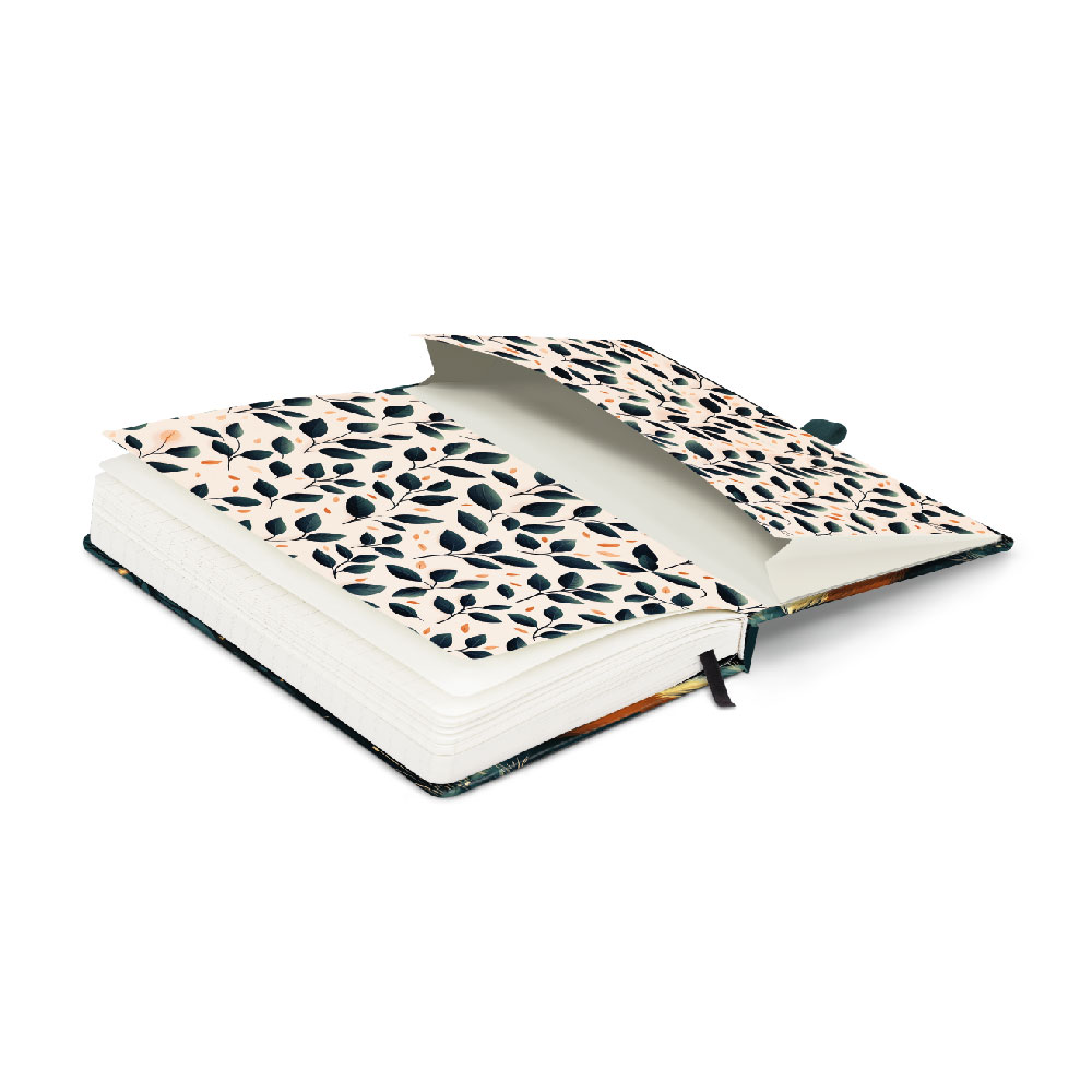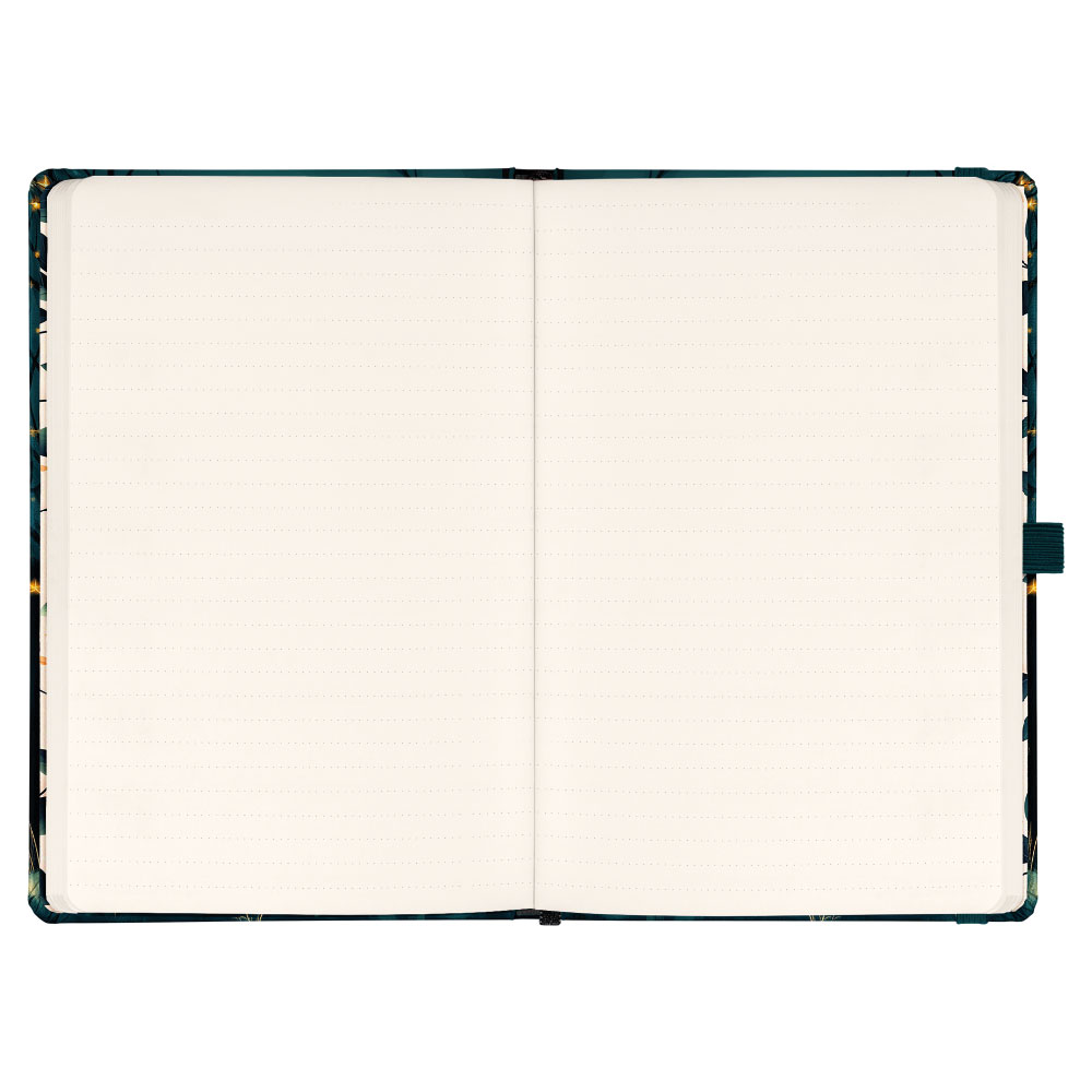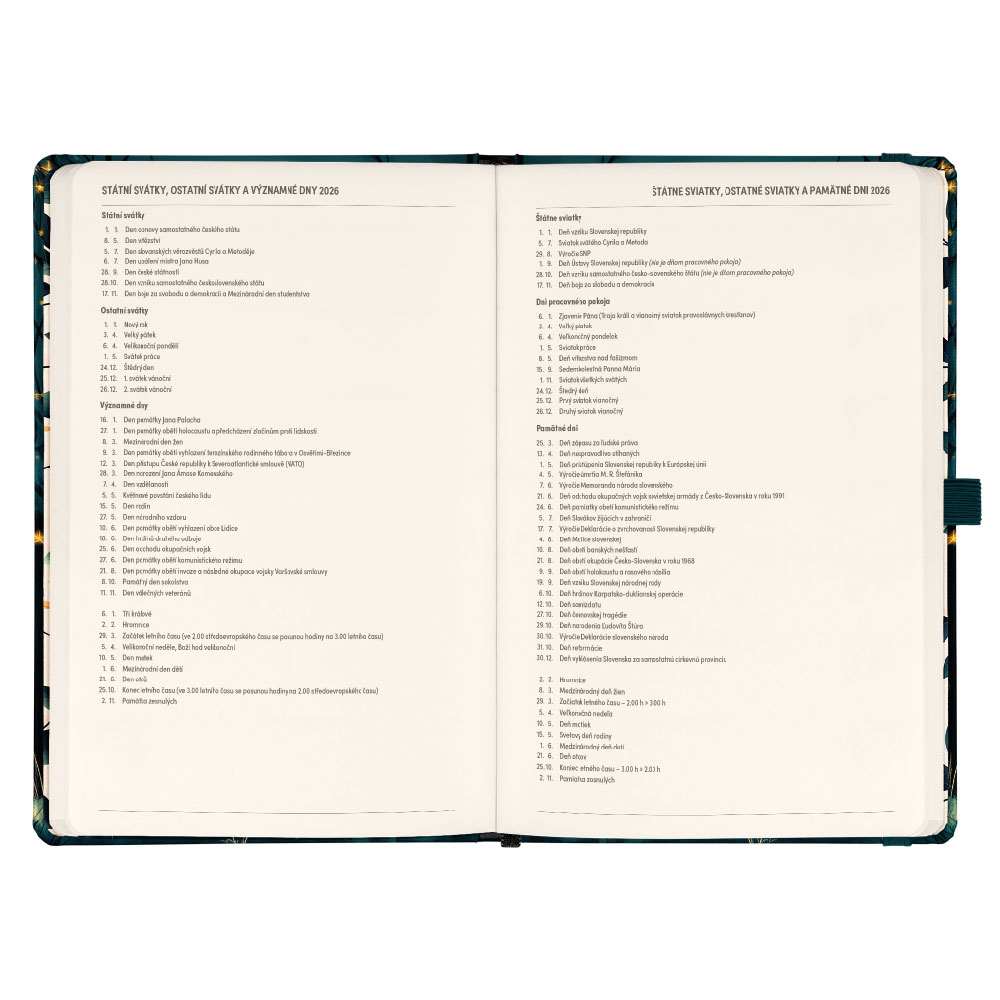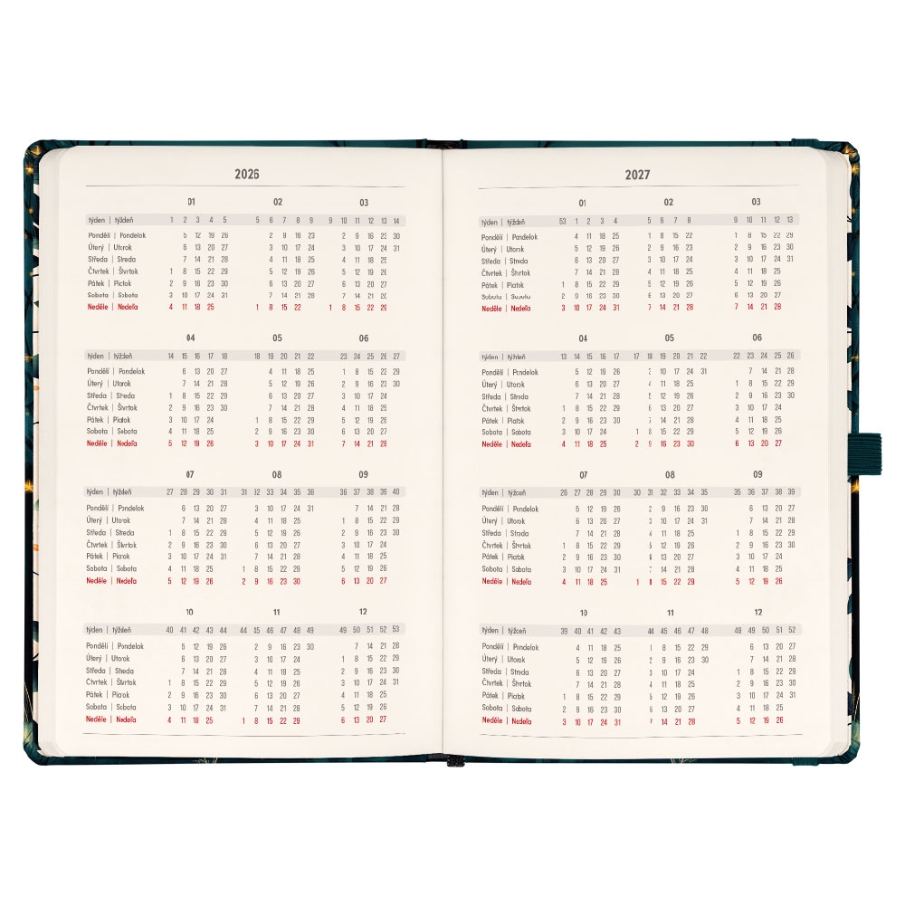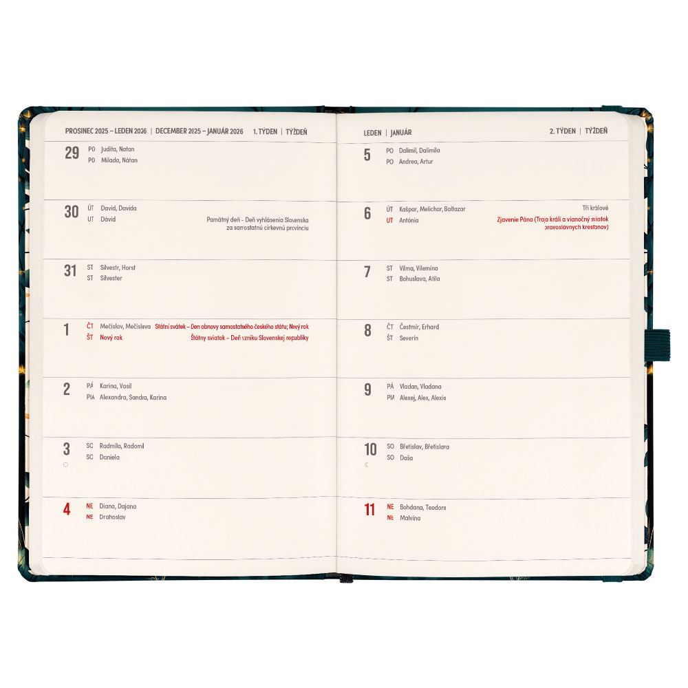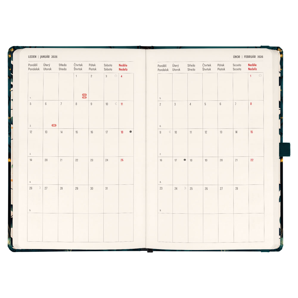 Součástí je záložka, poutko na tužku a vnitřní kapsa.