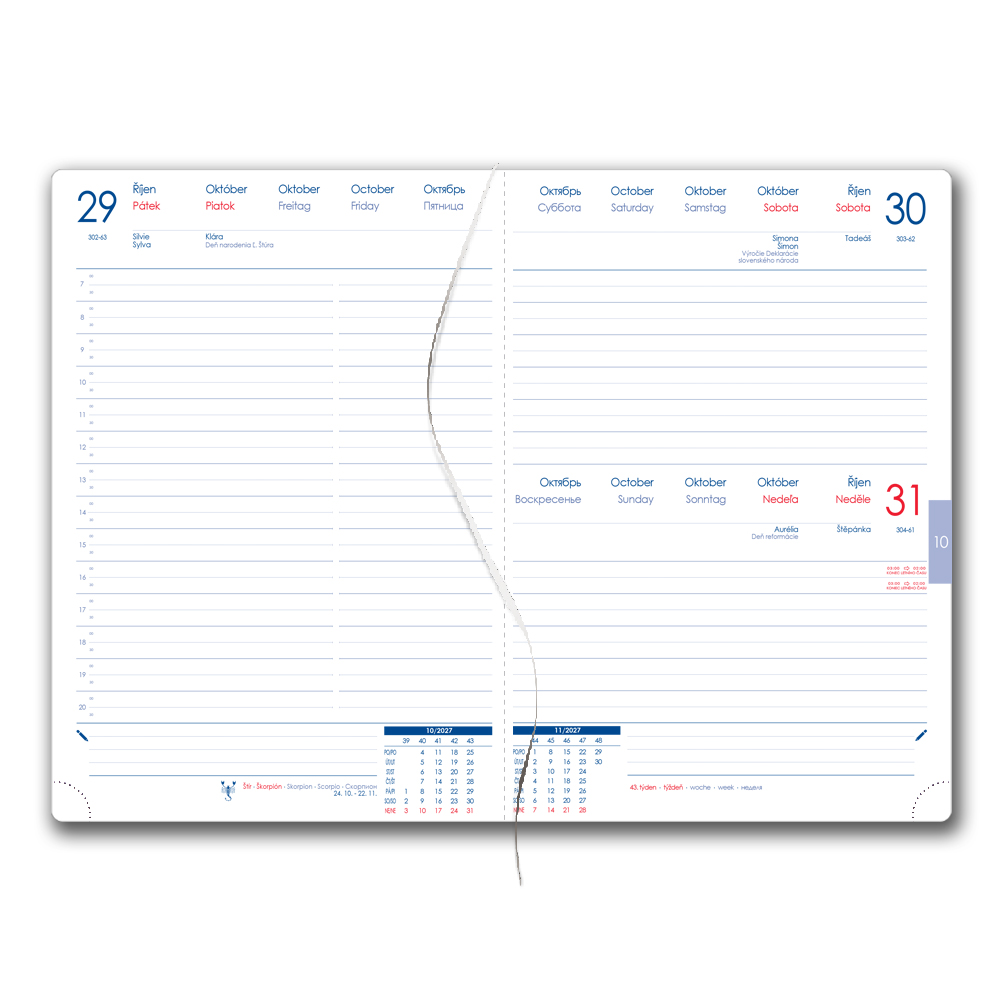 Diář obsahuje: kulaté odtrhávací rožky, bílou záložku a propisku
