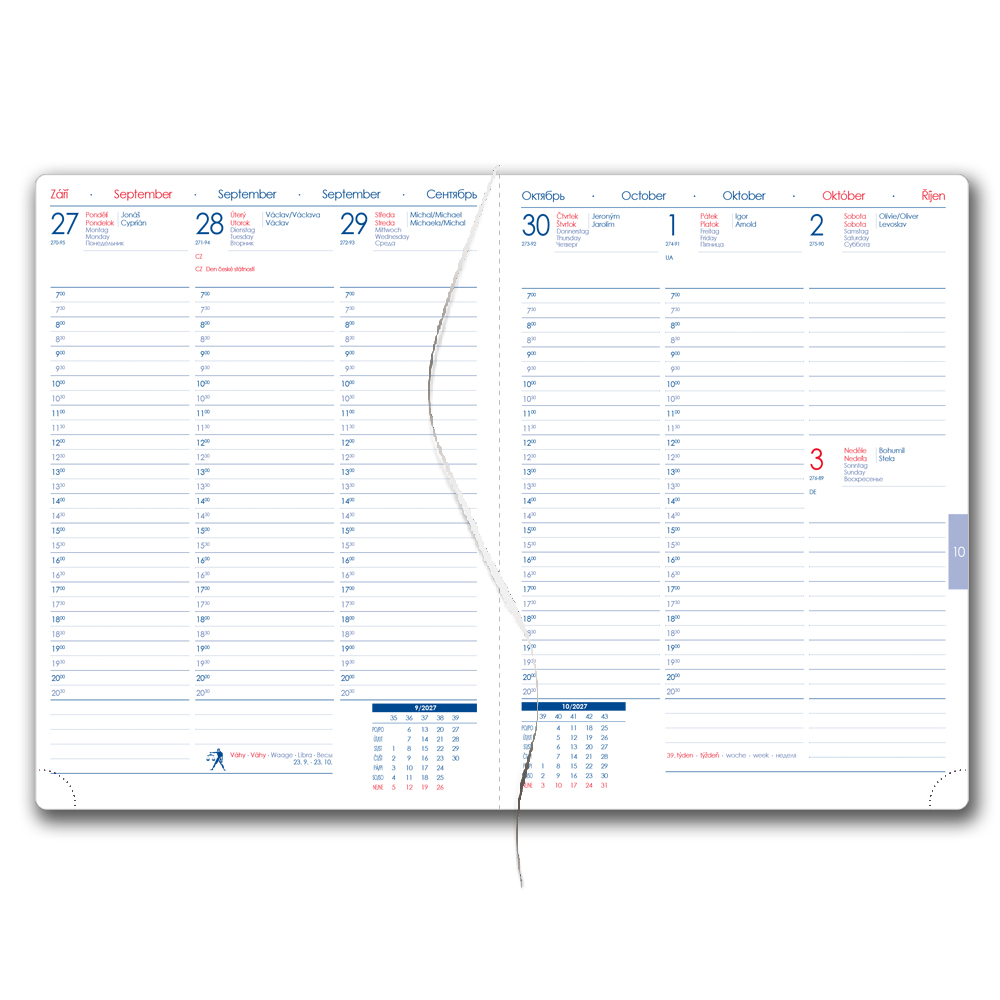 Diář obsahuje: kulaté odtrhávací rožky, bílou záložku a propisku