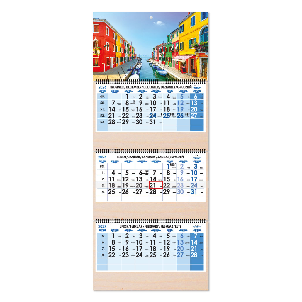 Dřevěný tříměsíční kalendář Trio Wood Benátky skládaný český se spirálou 2027 - modrý