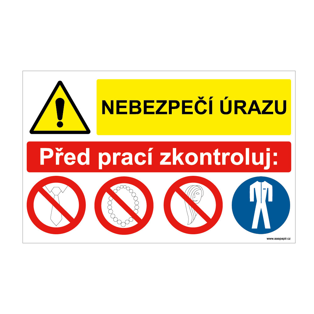 NEBEZPEČÍ ÚRAZU - PŘED PRACÍ ZKONTROLUJ, KOMBINACE, plast 2 mm 95x60 mm