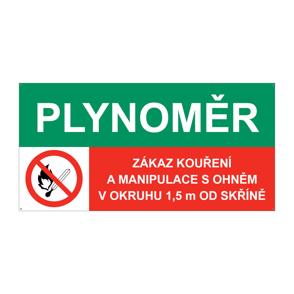 PLYNOMĚR - ZÁKAZ KOUŘENÍ A MANIPULACE S OHNĚM V OKRUHU 1,5 M OD SKŘÍNĚ, KOMBINACE, plast 2 mm s dírkami 150x75 mm