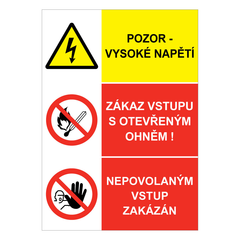 POZOR VYSOKÉ NAPĚTÍ - ZÁKAZ VSTUPU S OTEVŘENÝM OHNĚM - NEPOVOLANÝM VSTUP ZAKÁZÁN, plast 1 mm, A5