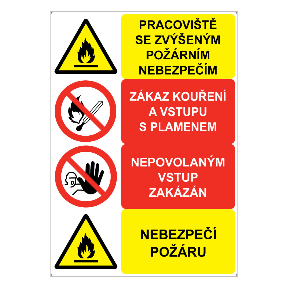 PRACOVIŠTĚ SE ZVÝŠENÝM POŽÁRNÍM NEBEZPEČÍM - ZÁKAZ KOUŘENÍ -NEPOVOLANÝM - NEBEZPEČÍ, plast 2 mm s dírkami, A5