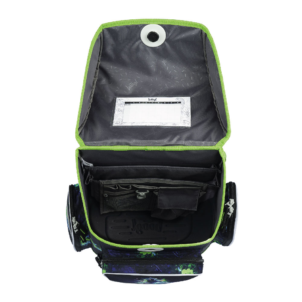 • Uvnitř aktovky je průhledná kapsa na rozvrh a vnitřní organizér umožňující rovnoměrné rozložení hmotnosti.