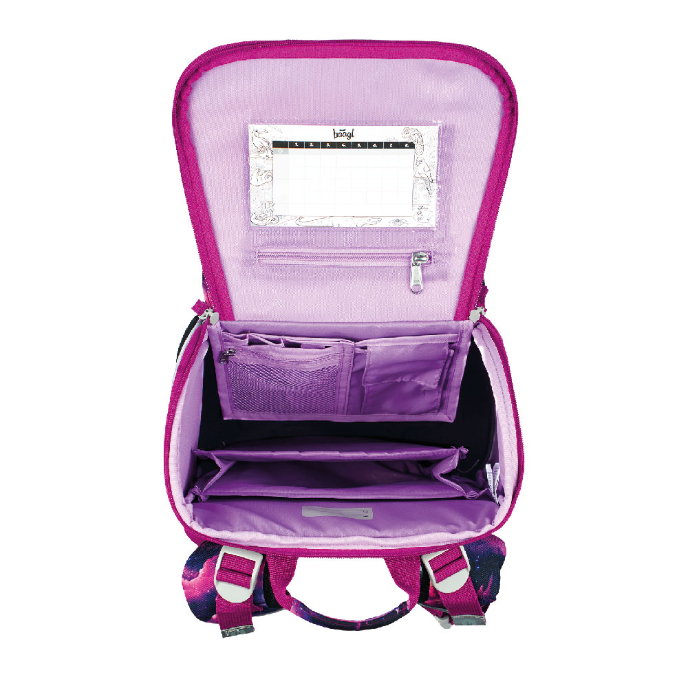 • Uvnitř aktovky je průhledná kapsa s rozvrhem a vnitřní organizér umožňující rovnoměrné rozložení hmotnosti, doplněný gumičkou pro fixaci.