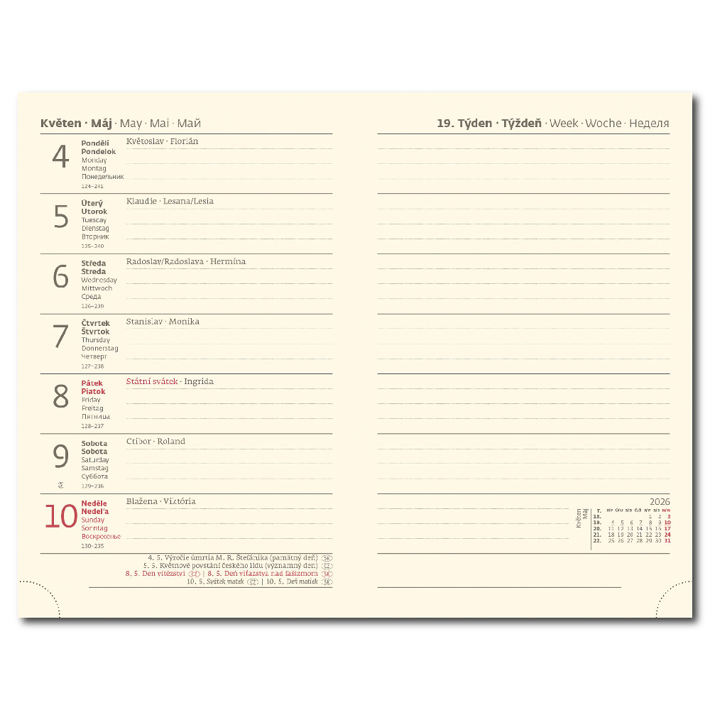 mezinárodní svátky, roční výhled, týdenní layout, adresář.