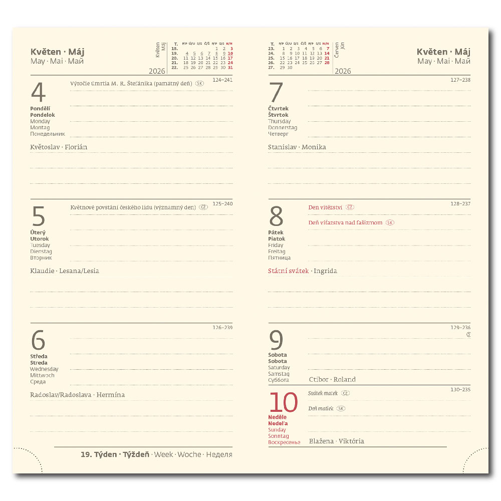 mezinárodní svátky, roční výhled, týdenní layout, adresář.